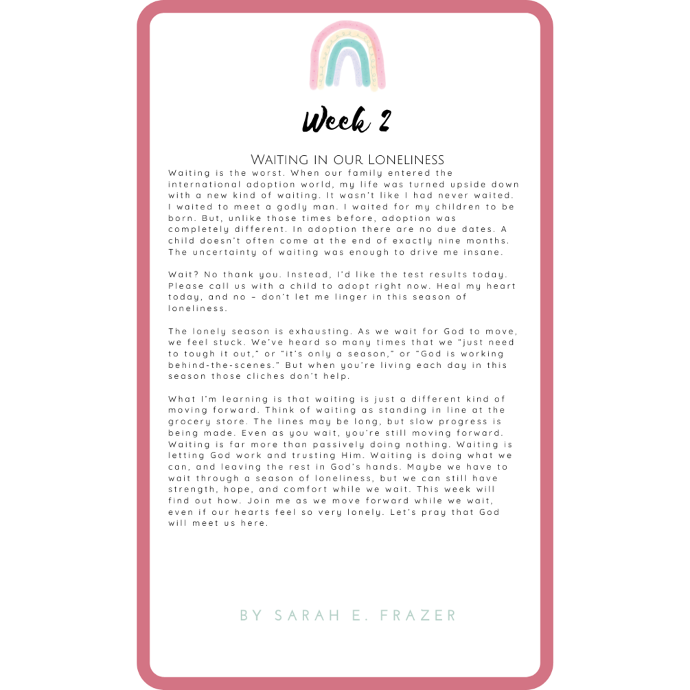 Instead of feeling trapped, empty, and unseen, choose to embrace this season. Cling to the aloneness. Let it enfold your heart, wrapping you tight in the love of Christ. Seize the loneliness and change it.